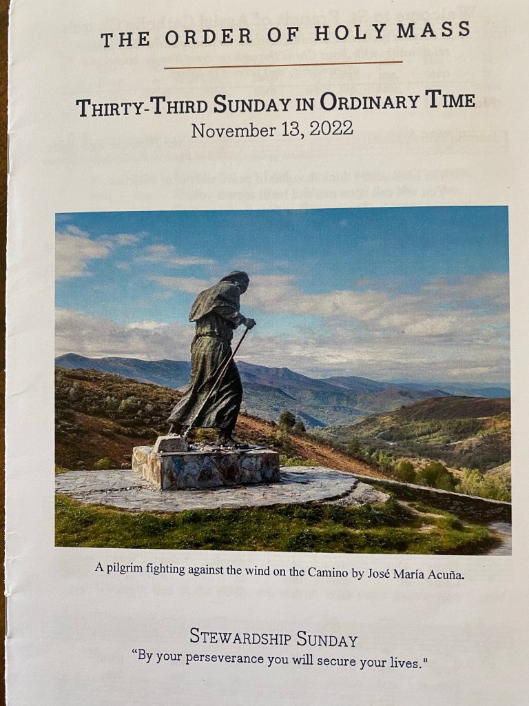 My Camino trip is less than 3 weeks away. I still cannot believe I will be making this trip. I truly believe I was invited by God to make this pilgrimage. The journey began when I was handed The Order of The Holy Mass featuring the statue of a pilgrim fighting against the wind.